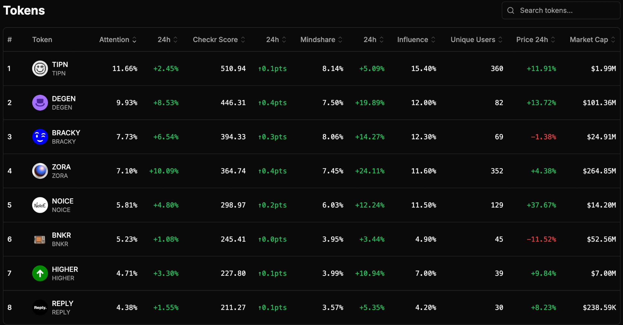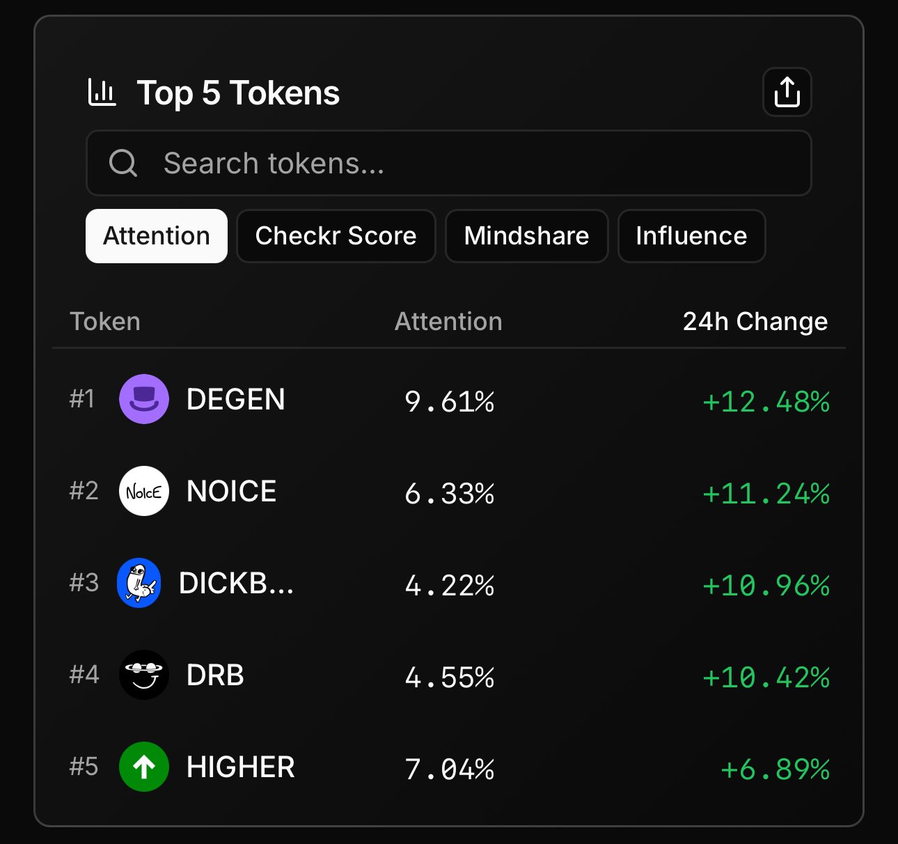 Top 5 tokens by Attention (24h change):