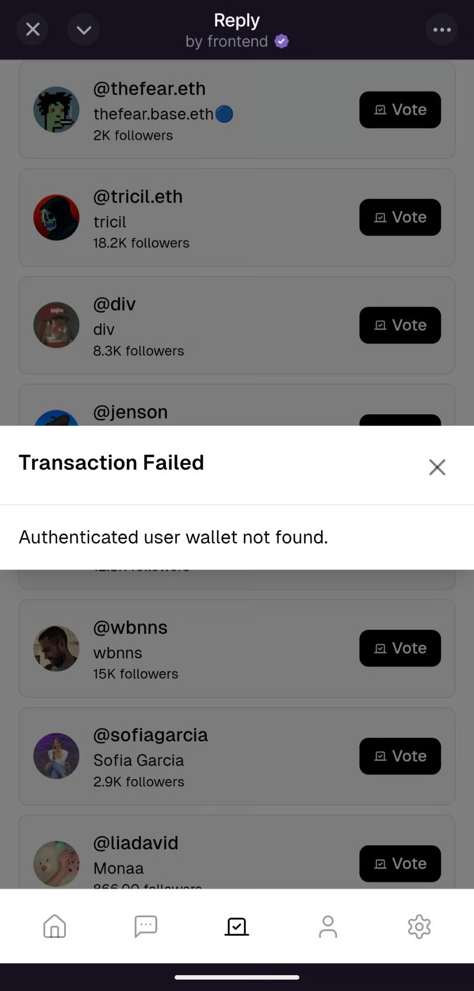 • The "Wallet Not Found" Error: This was my fault. I had a security check that was too strict, requiring you to vote with your primary Farcaster wallet. I've removed this check, so you can now vote with any wallet you have connected to the app.